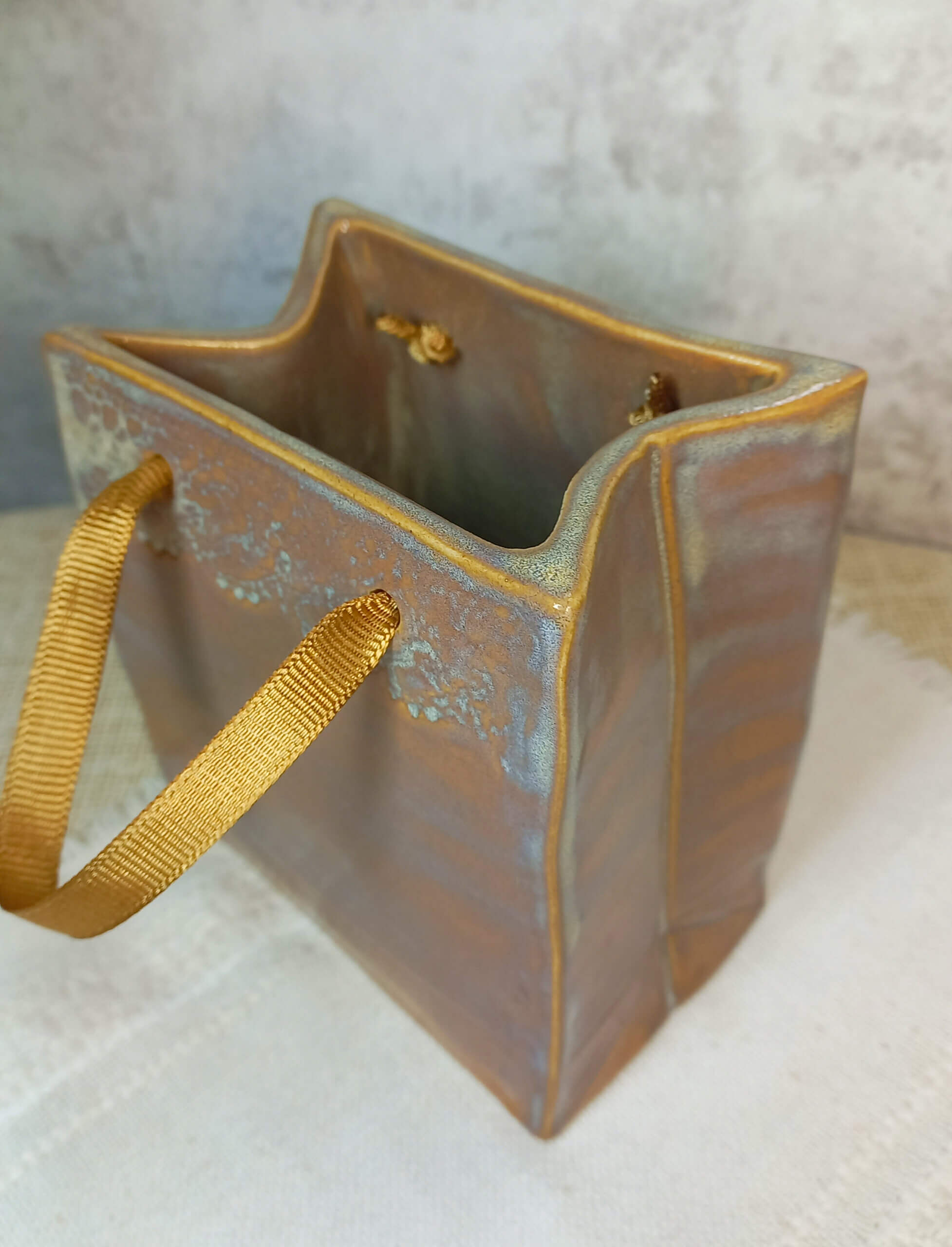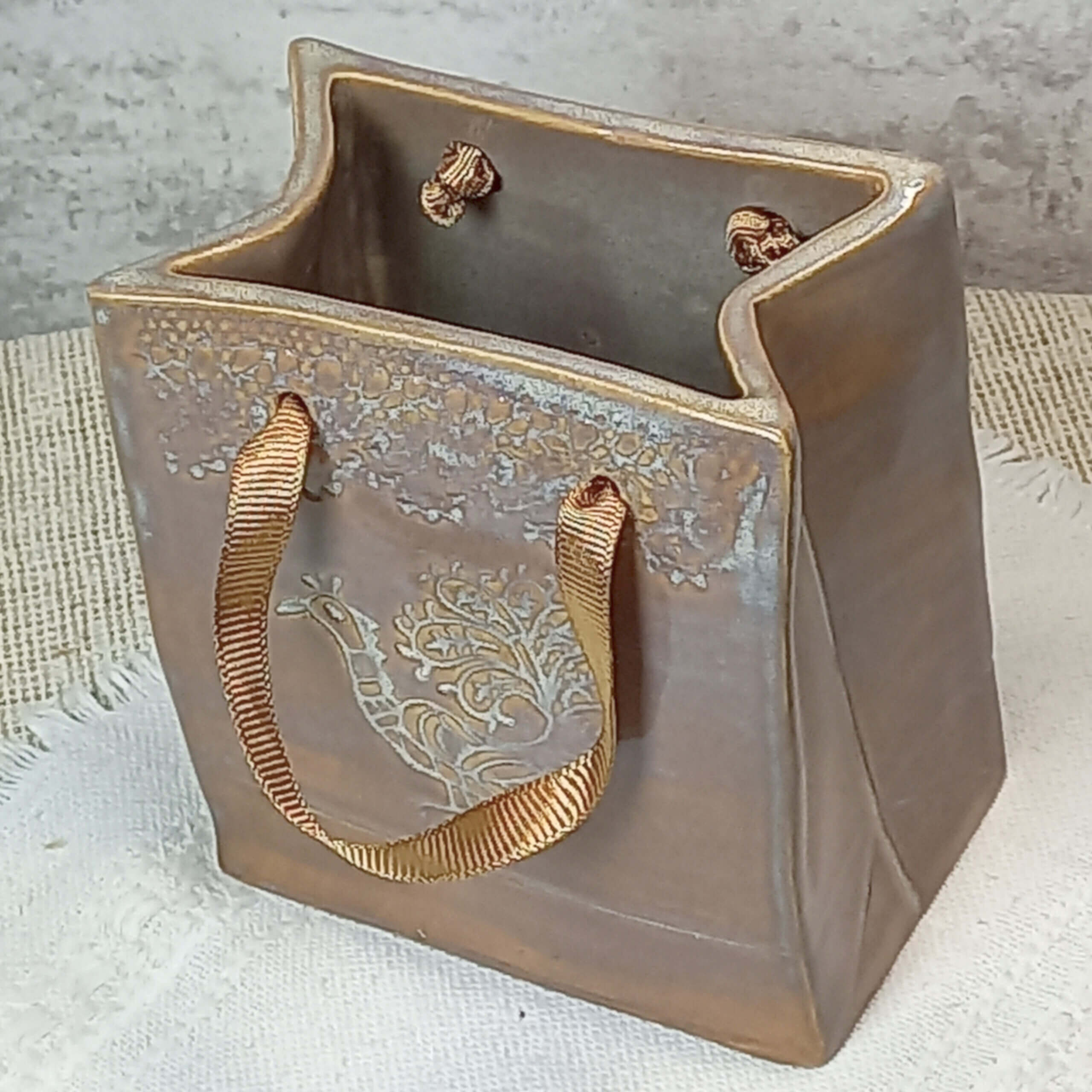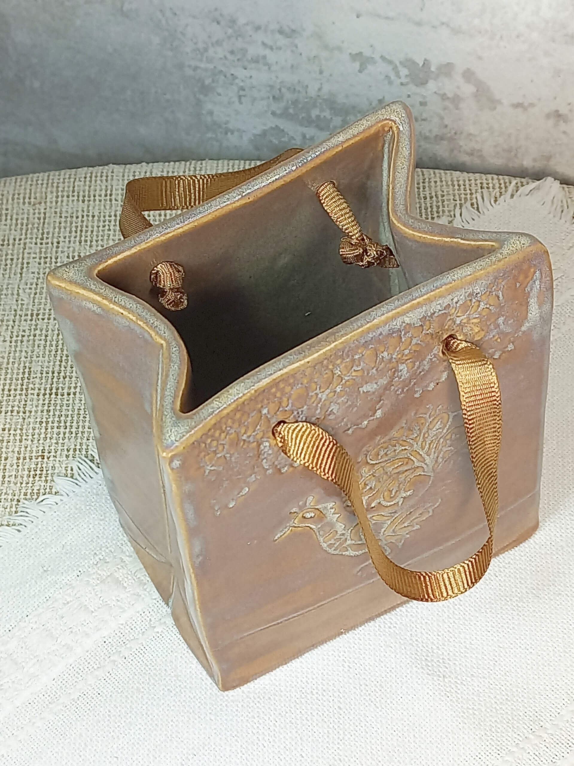 Käsitööna valminud, masinpestav keraamiline , kinkekoti kujuline, paeltest sangadega väike vaas